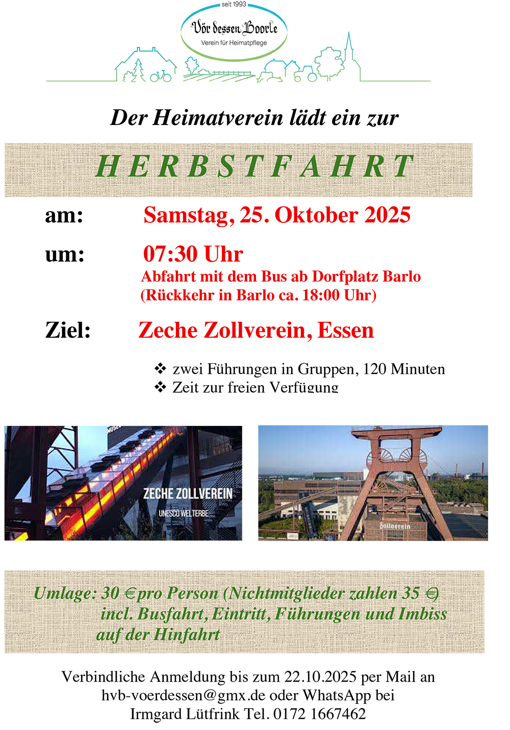 Der Heimatverein „Vör dessen Boorle“ veranstaltet am Samstag, 25. Oktober seine diesjährige Herbstfahrt. Wir fahren gemeinsam mit dem Bus nach Essen zum UNESCO-Welterbe Zeche Zollverein: Treffen ist um 07:30 Uhr am Dorfplatz Barlo. Vormittags gibt es zwei Führungen zu unterschiedlichen Themen auf dem Zechengelände. Der Nachmittag steht zur freien Verfügung.